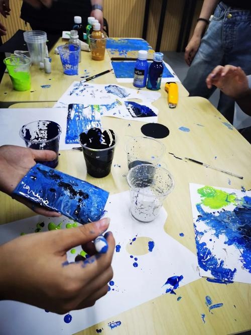 流体画是同学们从未接触过的一个新的领域,当老师把绘画材料带来的时候,同学们的眼神中都透露着新奇。这部分Vivienne老师是让同学们通过流体画自由灵动的形式,创造自己的作品,而不是被固有的造型所束缚,同时通过这种特殊材料练习颜色的配比,为后期对于颜色的调配打下一个坚实的基础。