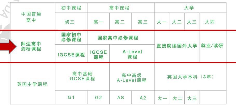 2019年,北京市师达中学经剑桥大学国际考评部(Cambridge Assessment International Education)授权, 成为剑桥国际成员单位(编号CN389)。我校设立“剑桥国际课程中心”和“剑桥国际考试中心”。 三、中、英高中课程设置对比