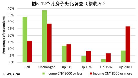 让我们看看RIWI在9-11月获得的回复。RIWI按收入组别对12个月的公寓价格变化进行分类(图5)。对于月收入不超过3000元的低收入群体,34%的人报告房价下跌,39%的人报告房价保持不变,28%的人报告房价上涨。
